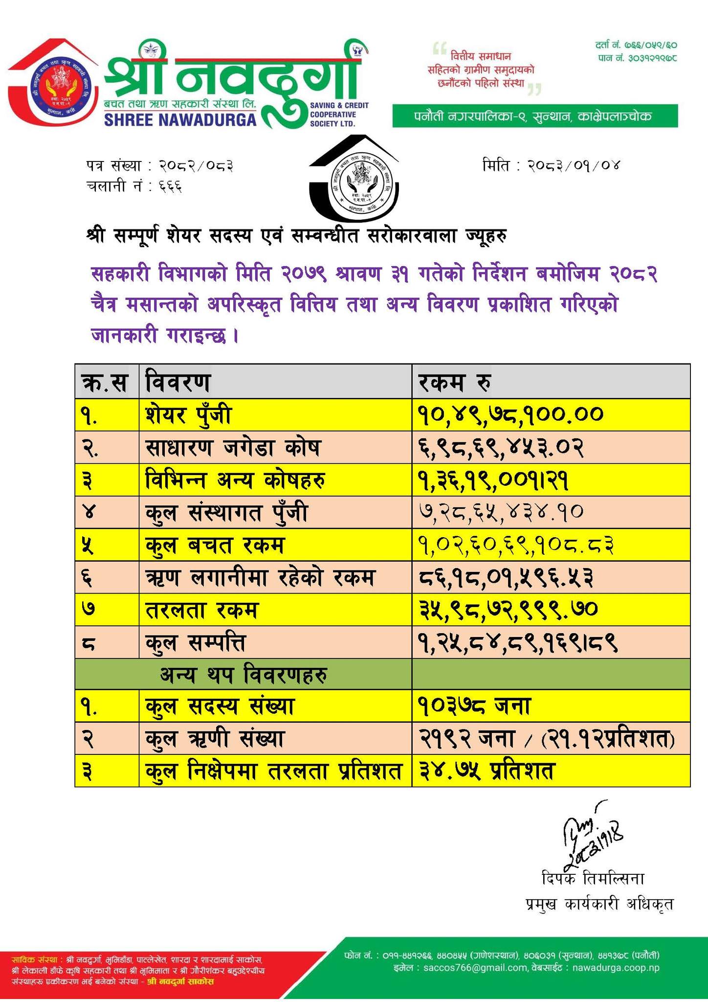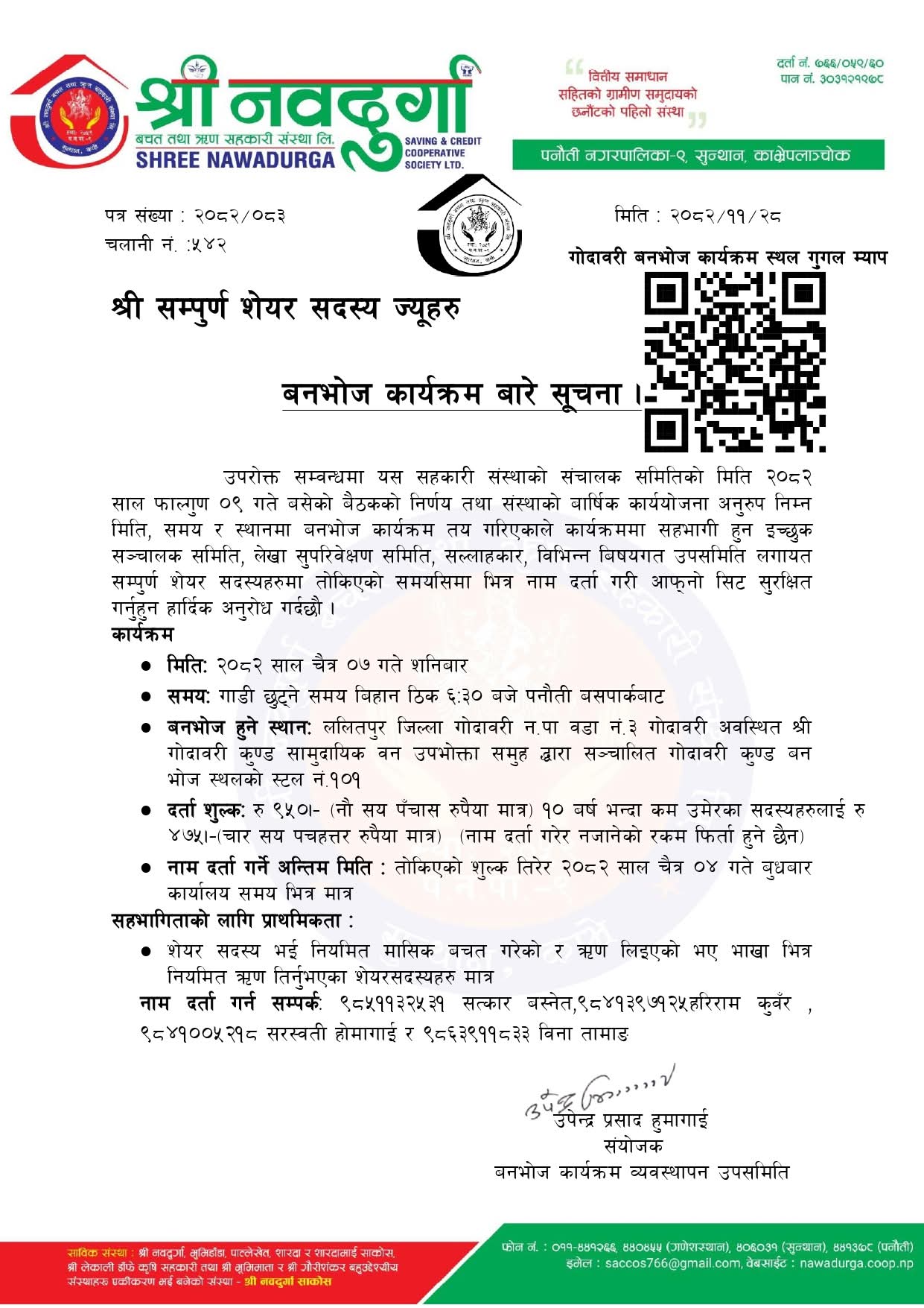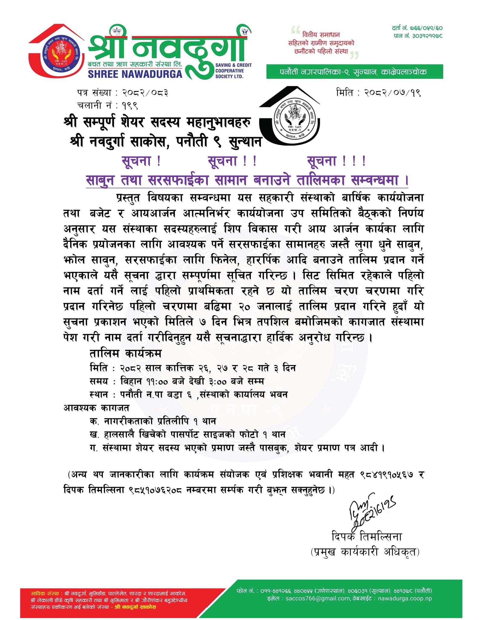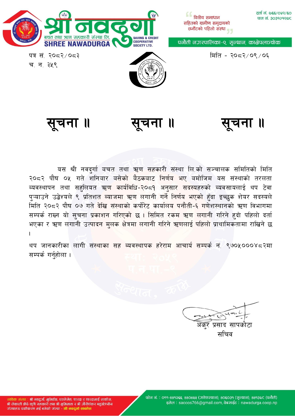 सहकारी ऐन २०४८ र सहकारी नियमावली २०४९ आएपछि मुलुकभर सहकारी संस्थाहरु स्थापना हुने क्रम भयो, दर्ता हुनु भन्दा पहिले साविक पनौती न.पा वडा नं १० सिकारीगाँउ का युवा युवतीहरुले मेलापातमा काम गर्दा गर्दै समुह निमार्ण गर्ने र मासिक सकेको बचत गर्दै जाने उद्धेश्यका साथ यस सहकारी नवदुर्गा समूहको नामले २०५८ चैत्र २ गते देखि व्यावहारिक रुपमा २६ जना सदस्यहरुबाट सुरु भएको थियो । जसमा सदस्यहरु मासिक रुपमा रु २५।–देखी रु१०० रुपैया मासिक रुपमा वचत जम्मा गर्दै गएकोमा यसै क्रममा यो संस्था सहकारी ऐन र नियमावलीको परिधि भित्र रही २०५९ पौष २६ गते डिभिजन सहकारी कार्यालयमा दर्ता (द.नं ७६६.०५९.०६०) भई सञ्चालन भइरहेकोमा २०६८ श्रावण ०८ गते ३ ओटा सहकारीहरु नवदुर्गा सकोस पनौती, पात्लेखेत साकोस पात्लेखेत गा.वि.स, भूमिडाँडा साकोस चलाल गणेशस्थान गा.वि.स का सहकारी एक आपसमा एकीकरण भई कार्यक्षे..