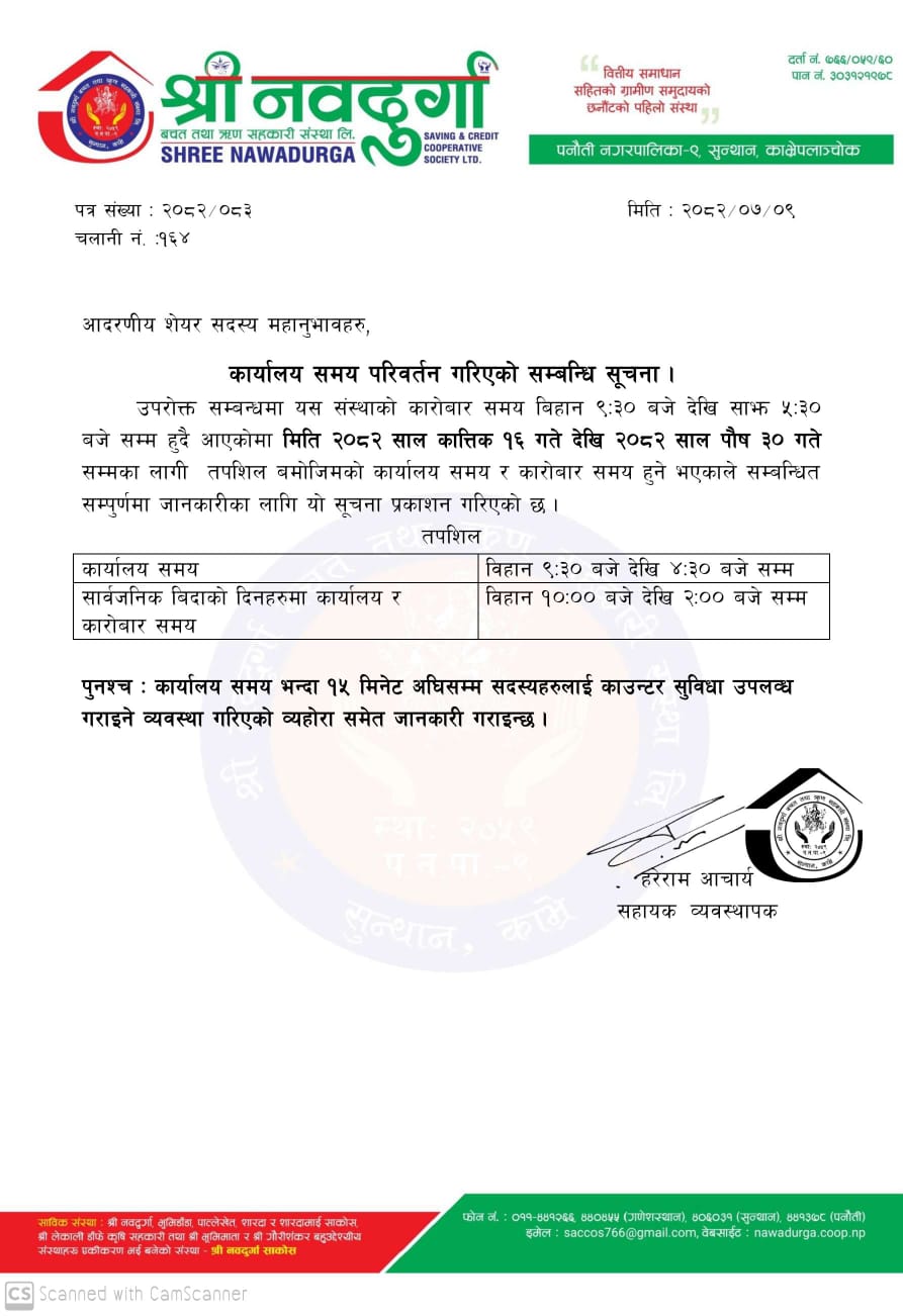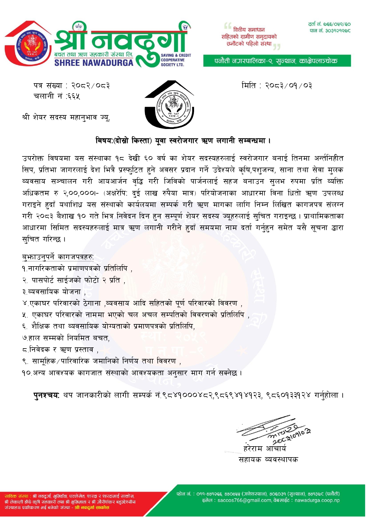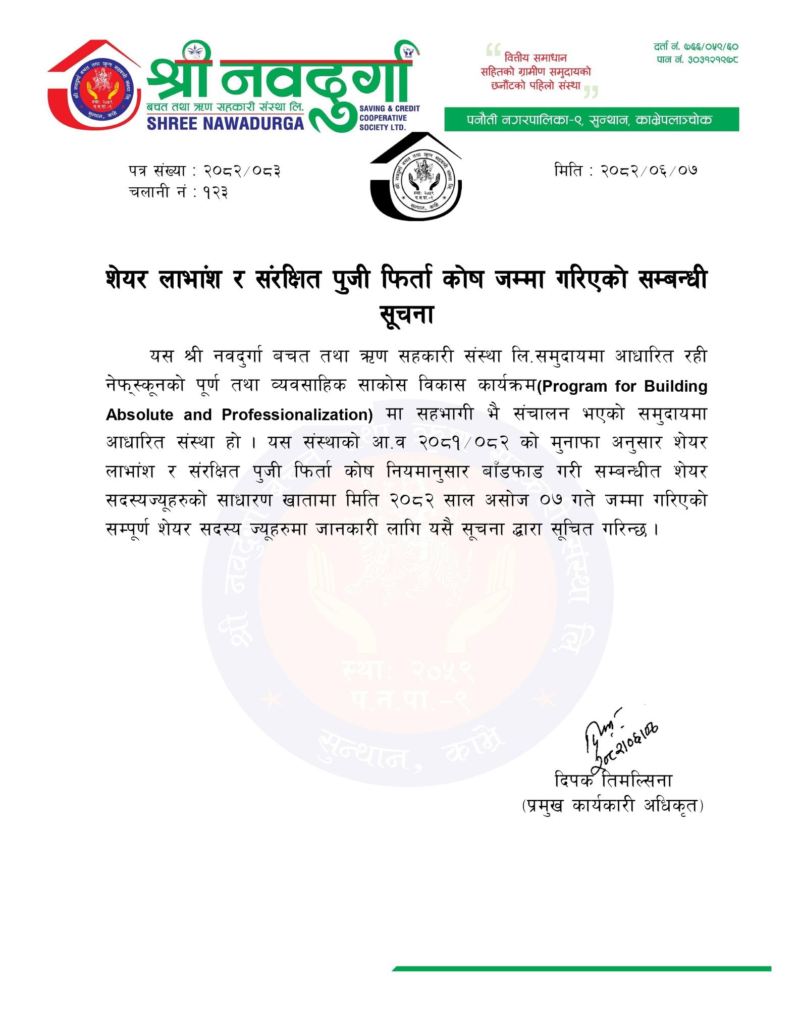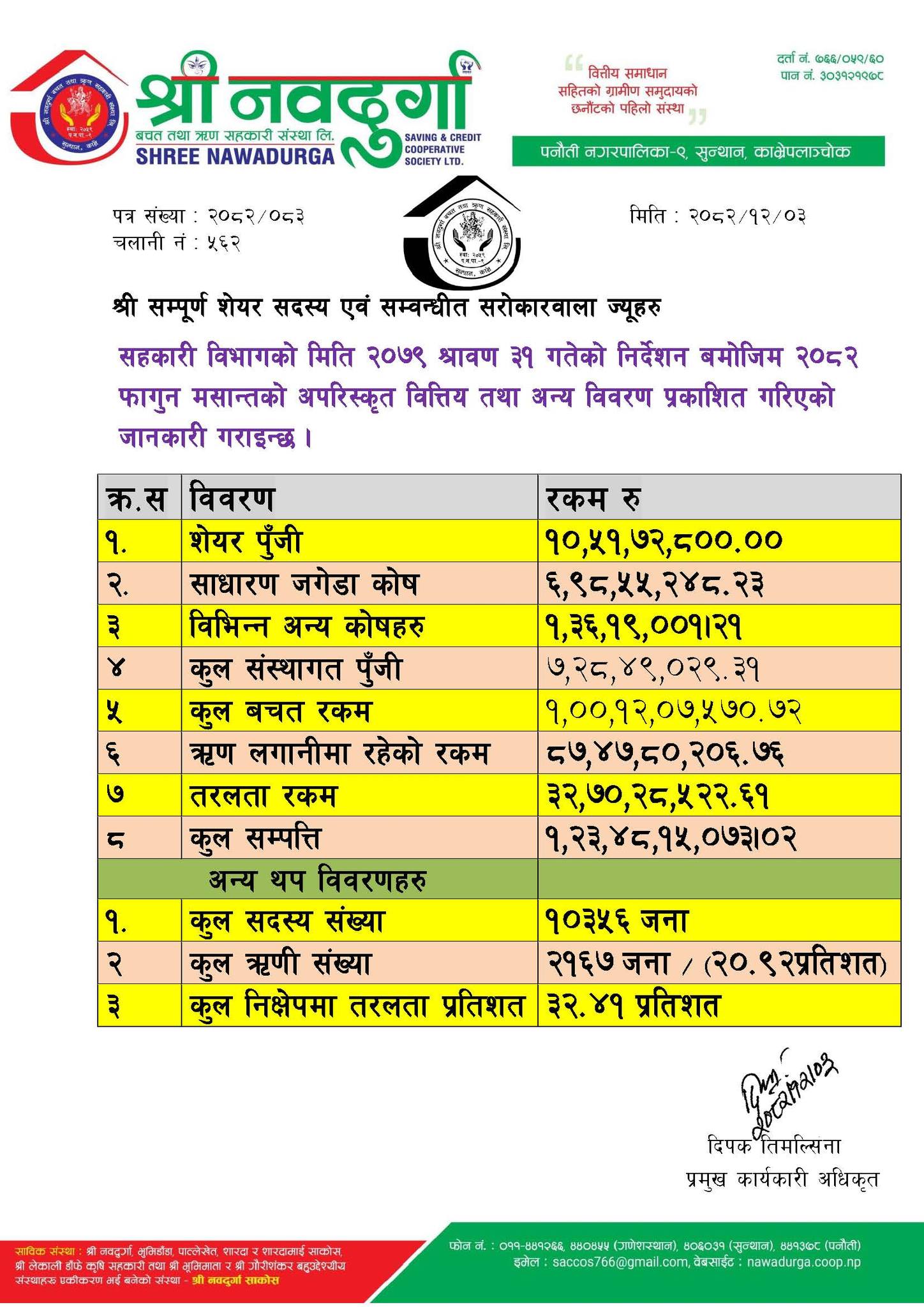 सहकारी ऐन २०४८ र सहकारी नियमावली २०४९ आएपछि मुलुकभर सहकारी संस्थाहरु स्थापना हुने क्रम भयो, दर्ता हुनु भन्दा पहिले साविक पनौती न.पा वडा नं १० सिकारीगाँउ का युवा युवतीहरुले मेलापातमा काम गर्दा गर्दै समुह निमार्ण गर्ने र मासिक सकेको बचत गर्दै जाने उद्धेश्यका साथ यस सहकारी नवदुर्गा समूहको नामले २०५८ चैत्र २ गते देखि व्यावहारिक रुपमा २६ जना सदस्यहरुबाट सुरु भएको थियो । जसमा सदस्यहरु मासिक रुपमा रु २५।–देखी रु१०० रुपैया मासिक रुपमा वचत जम्मा गर्दै गएकोमा यसै क्रममा यो संस्था सहकारी ऐन र नियमावलीको परिधि भित्र रही २०५९ पौष २६ गते डिभिजन सहकारी कार्यालयमा दर्ता (द.नं ७६६.०५९.०६०) भई सञ्चालन भइरहेकोमा २०६८ श्रावण ०८ गते ३ ओटा सहकारीहरु नवदुर्गा सकोस पनौती, पात्लेखेत साकोस पात्लेखेत गा.वि.स, भूमिडाँडा साकोस चलाल गणेशस्थान गा.वि.स का सहकारी एक आपसमा एकीकरण भई कार्यक्षे..