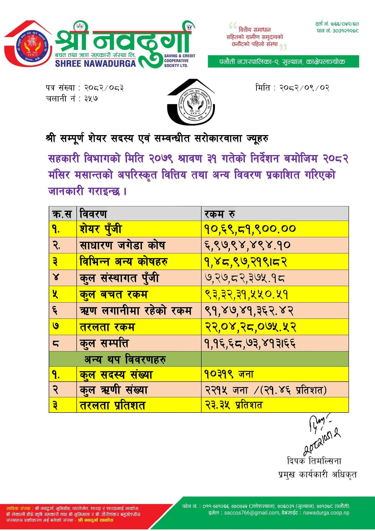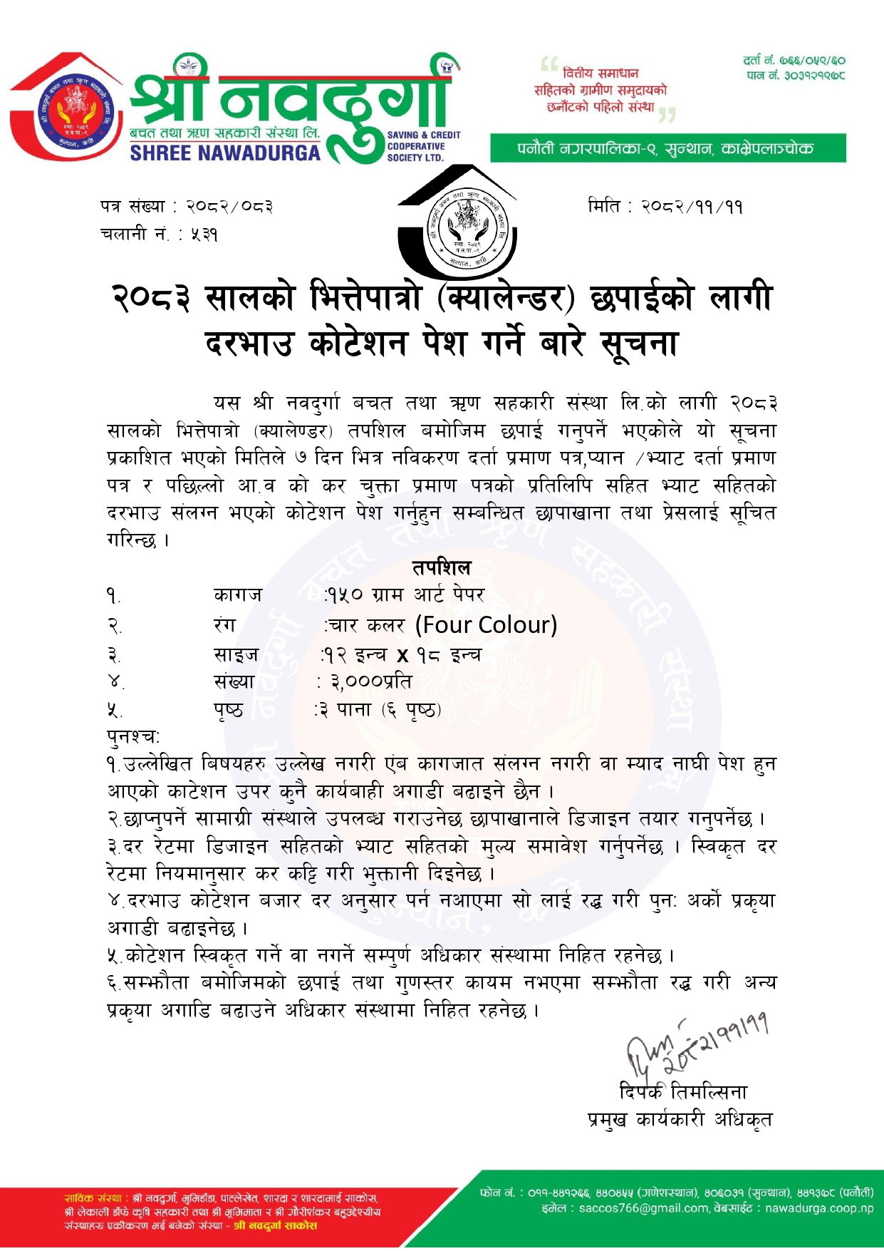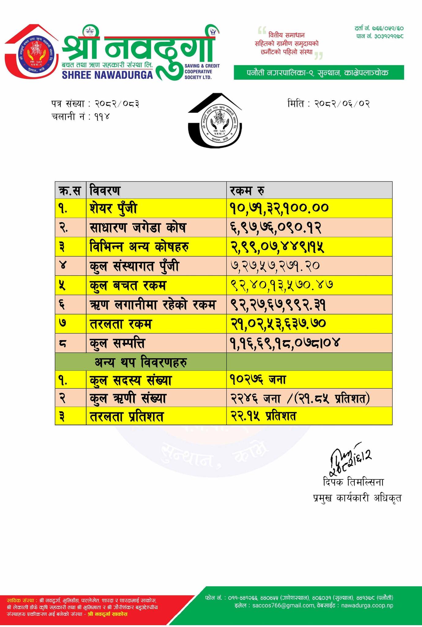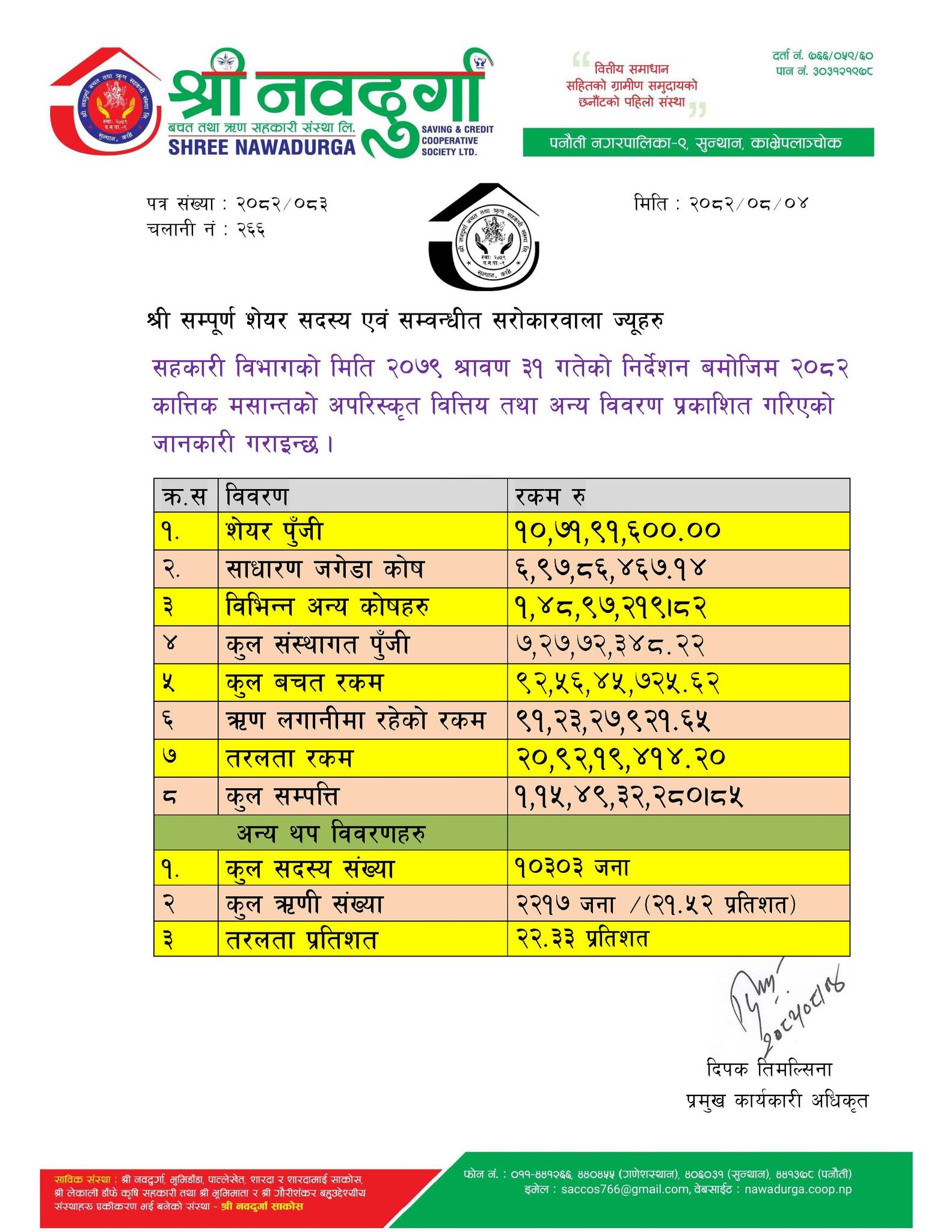 सहकारी ऐन २०४८ र सहकारी नियमावली २०४९ आएपछि मुलुकभर सहकारी संस्थाहरु स्थापना हुने क्रम भयो, दर्ता हुनु भन्दा पहिले साविक पनौती न.पा वडा नं १० सिकारीगाँउ का युवा युवतीहरुले मेलापातमा काम गर्दा गर्दै समुह निमार्ण गर्ने र मासिक सकेको बचत गर्दै जाने उद्धेश्यका साथ यस सहकारी नवदुर्गा समूहको नामले २०५८ चैत्र २ गते देखि व्यावहारिक रुपमा २६ जना सदस्यहरुबाट सुरु भएको थियो । जसमा सदस्यहरु मासिक रुपमा रु २५।–देखी रु१०० रुपैया मासिक रुपमा वचत जम्मा गर्दै गएकोमा यसै क्रममा यो संस्था सहकारी ऐन र नियमावलीको परिधि भित्र रही २०५९ पौष २६ गते डिभिजन सहकारी कार्यालयमा दर्ता (द.नं ७६६.०५९.०६०) भई सञ्चालन भइरहेकोमा २०६८ श्रावण ०८ गते ३ ओटा सहकारीहरु नवदुर्गा सकोस पनौती, पात्लेखेत साकोस पात्लेखेत गा.वि.स, भूमिडाँडा साकोस चलाल गणेशस्थान गा.वि.स का सहकारी एक आपसमा एकीकरण भई कार्यक्षे..